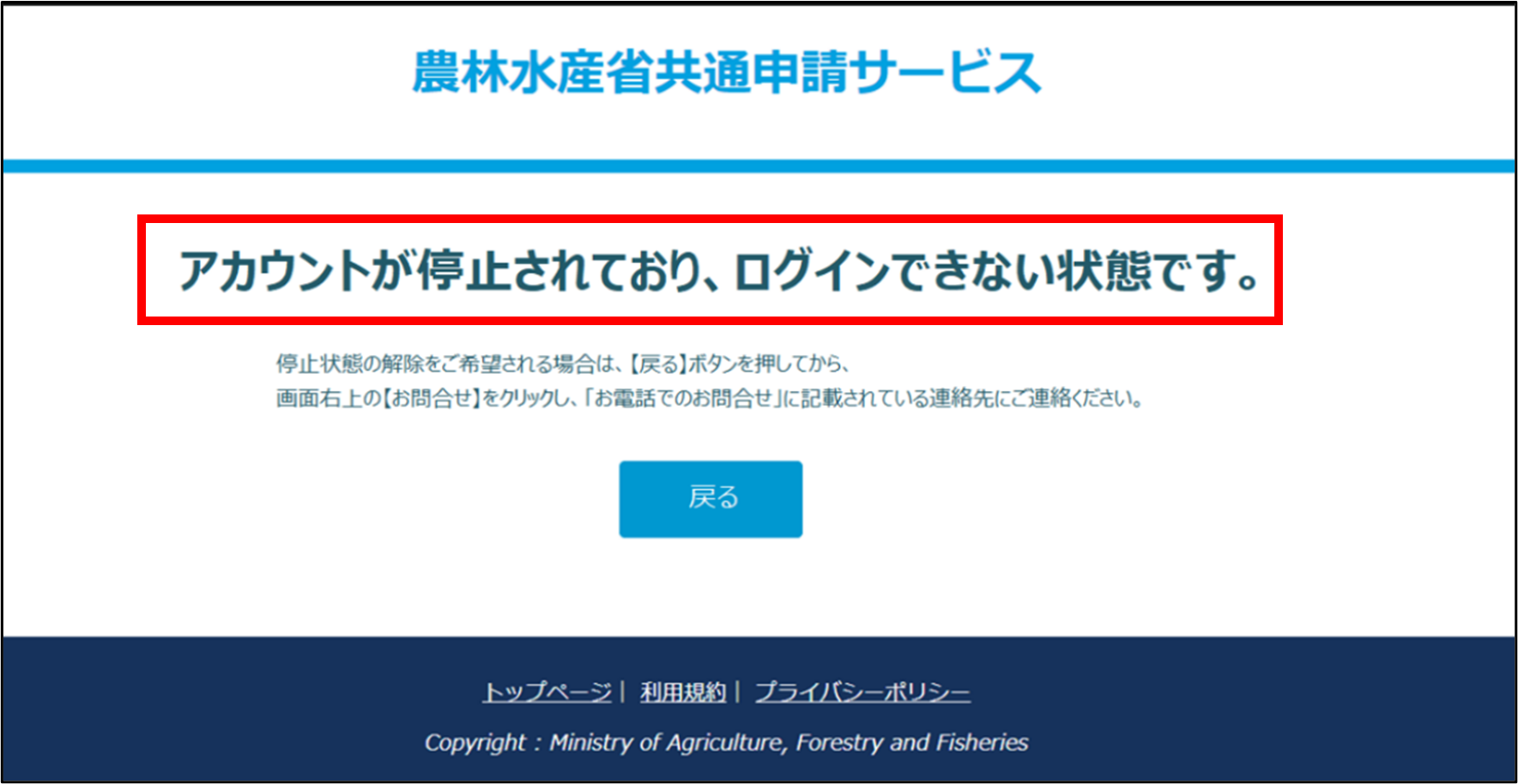 アカウントが「停止」されている場合、以下の画面が表示されます。 コールセンターにお問合せください。