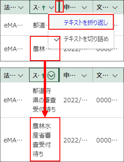2.「テキストを折り返し」を選択すると、対象項目の列内の幅に収まるように文字を折り返して表示します。