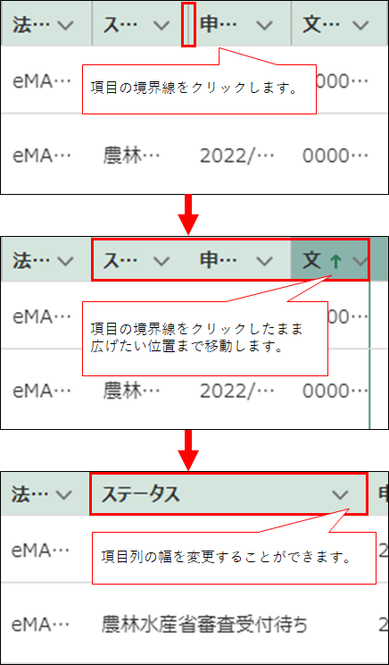 一覧の文字表示方法を以下の2通りから選択できます。また、表の列の幅を広げたり、狭くしたりすることができます。