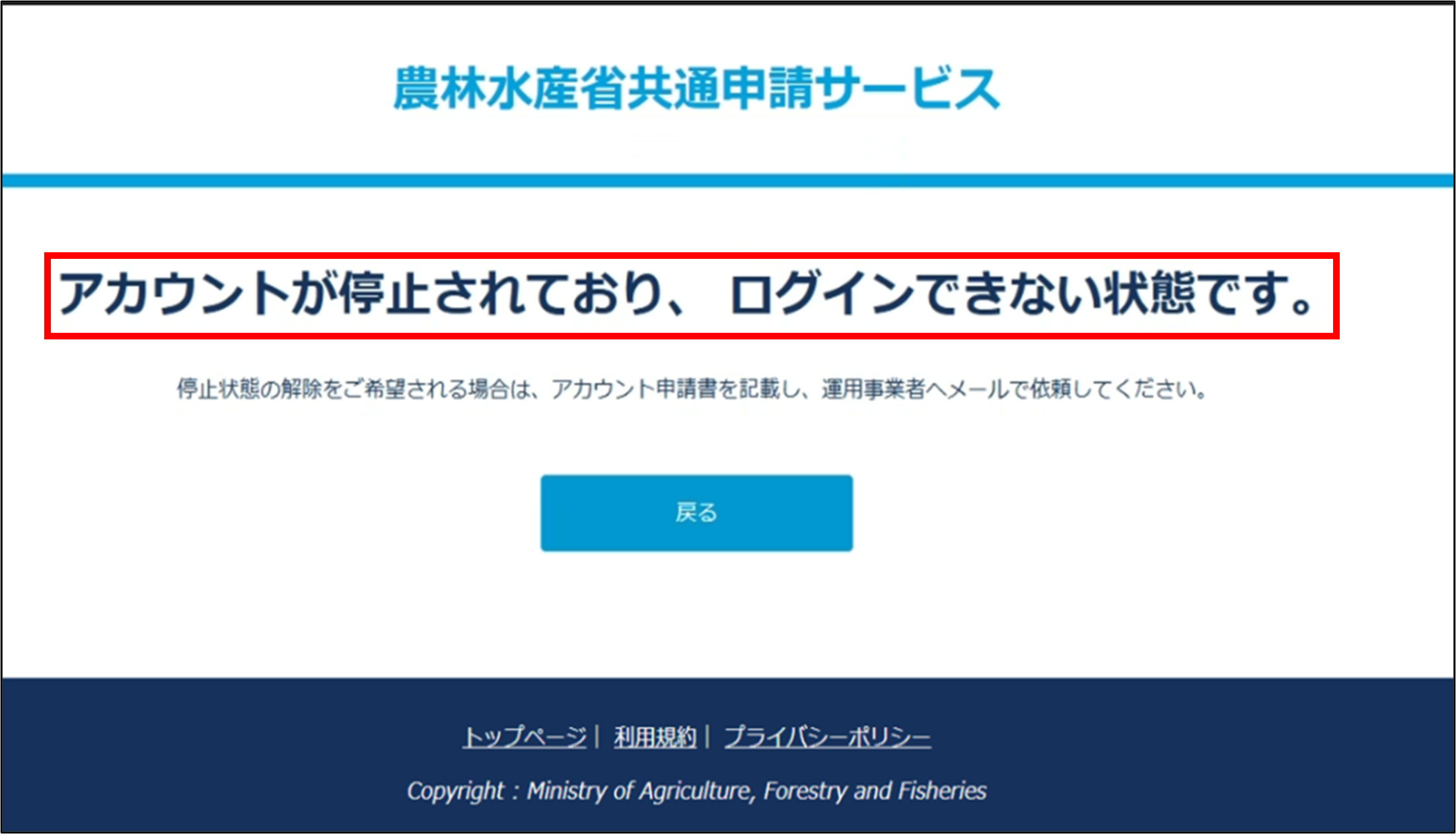 アカウントが「停止」されている場合、以下の画面が表示されます。 運用事業者に停止の解除を依頼してください。