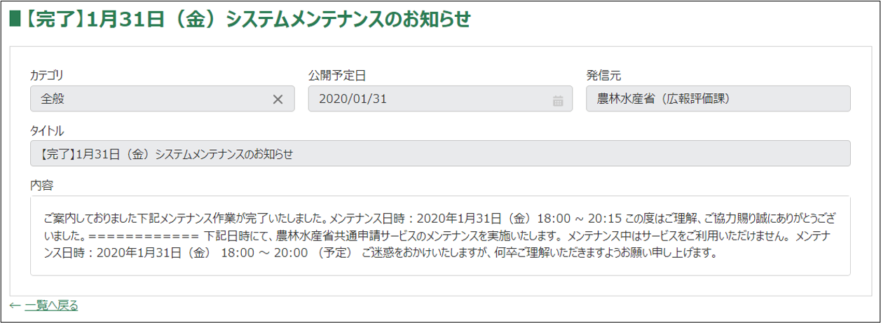 お知らせには、共通申請サービスの利用者に向けて、システムメンテナンス情報や電子申請受付開始のお知らせ等が表示されます。