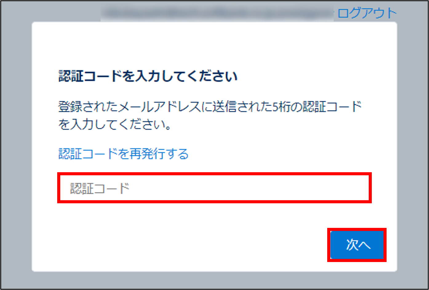 メールで受信した認証コード(5桁の数字)を「認証コード」欄に入力し、「次へ」ボタンをクリックします。