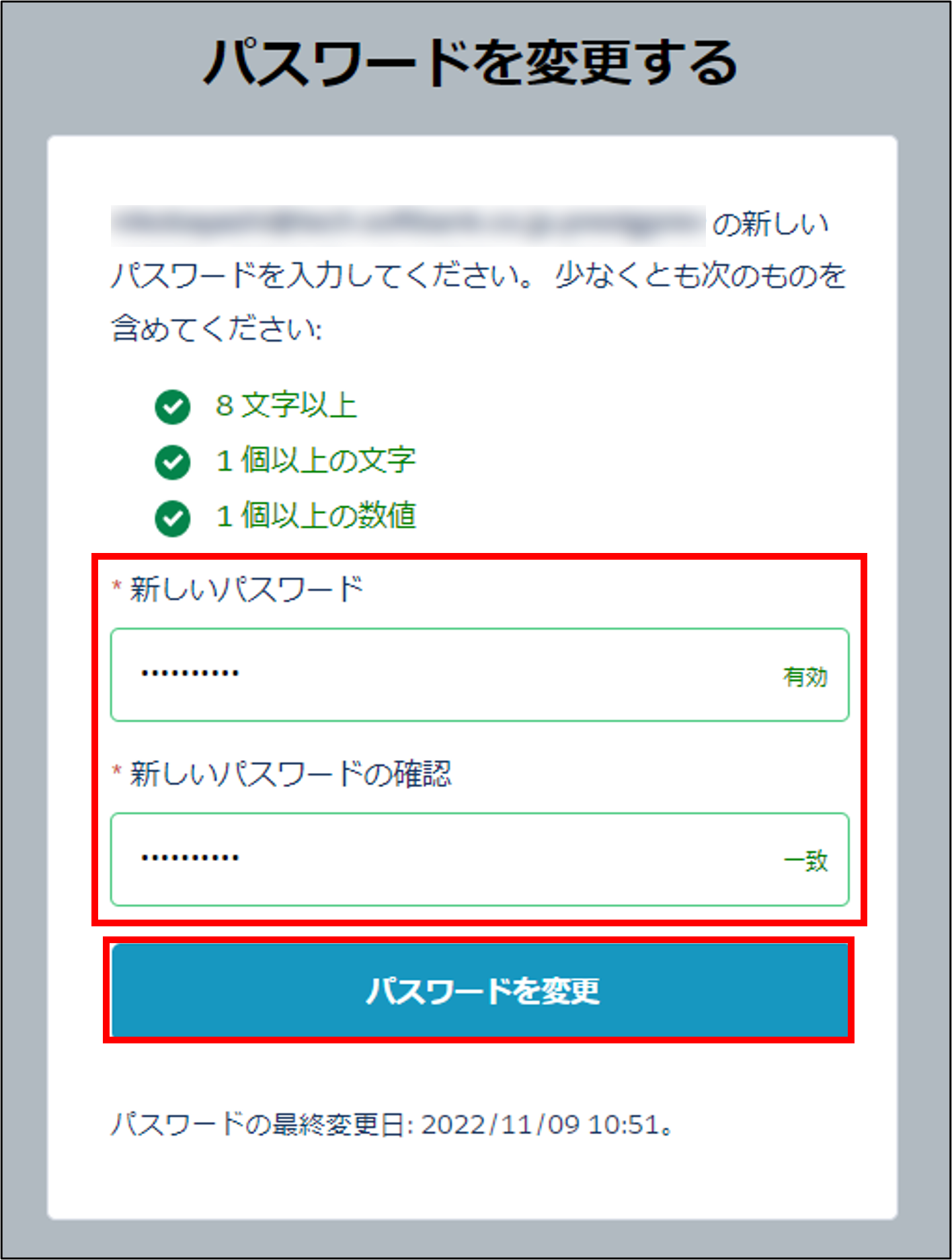 8.「パスワードを変更する」画面が表示されます。新しいパスワードを設定し「パスワードを変更」ボタンをクリックします。