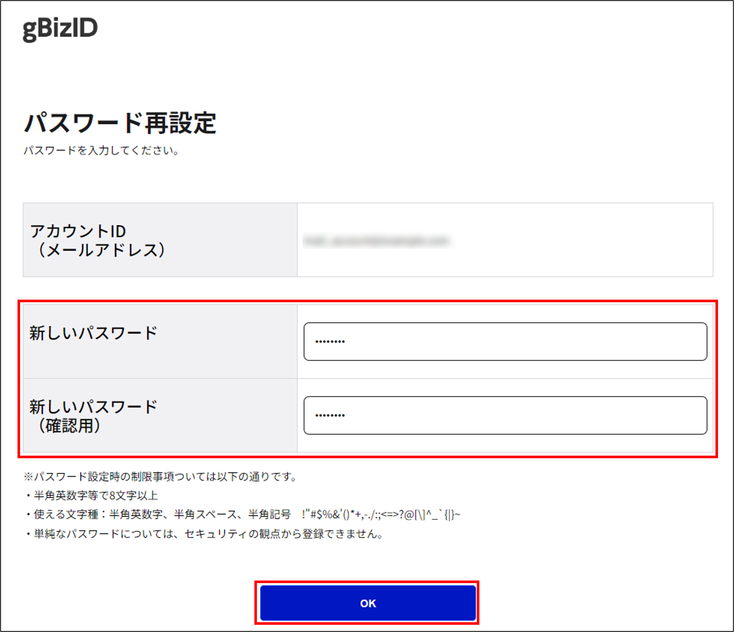 6.「パスワード再設定」画面が表示されます。新しいパスワードを設定し「OK」ボタンをクリックします。
