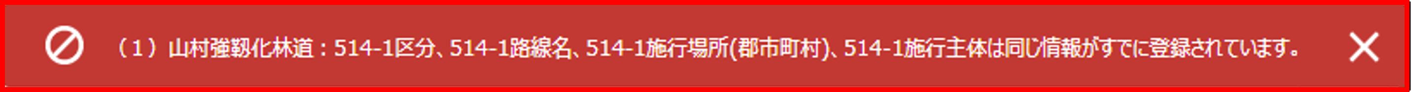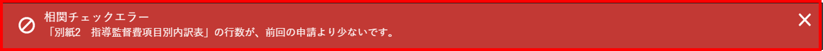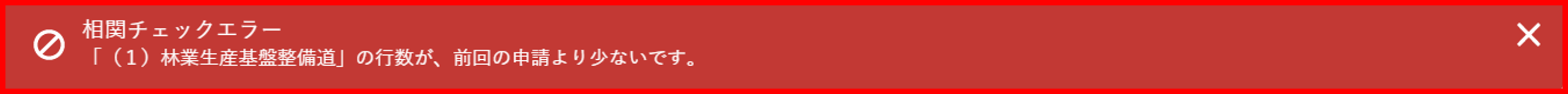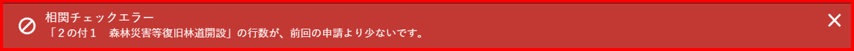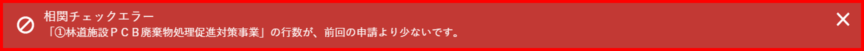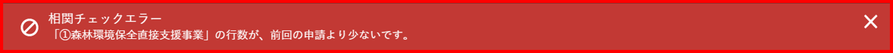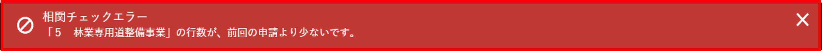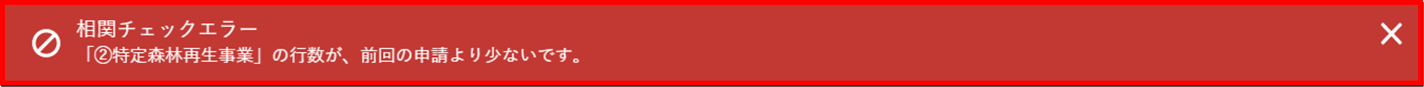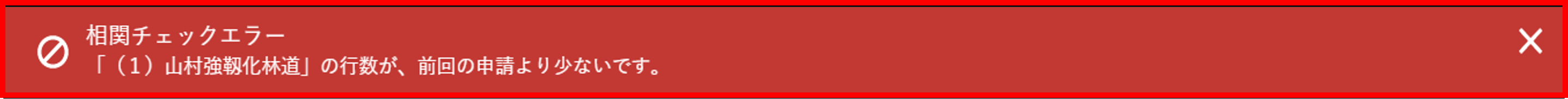エラーが見つかった場合は、画面上部に、赤い背景のエラーメッセージが表示され、申請が中断されます。