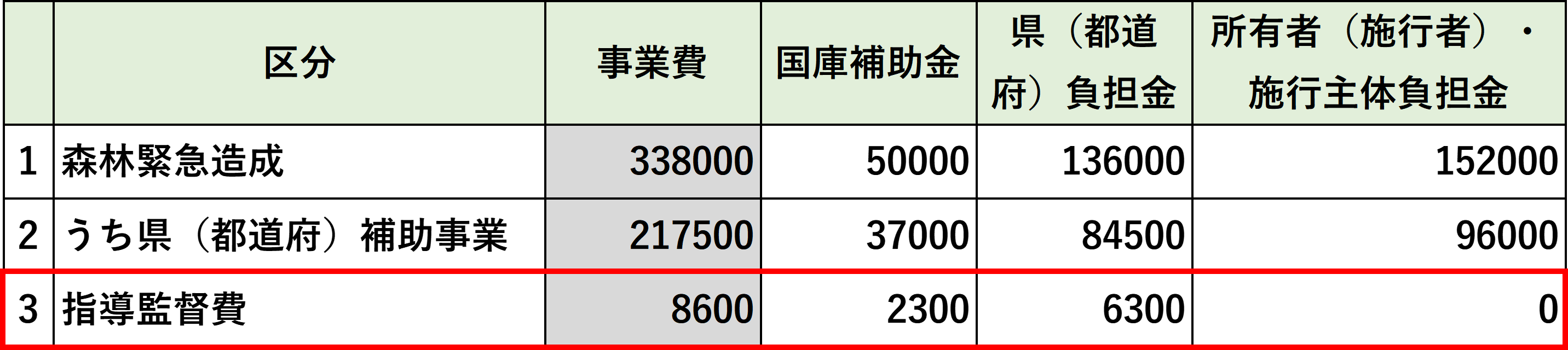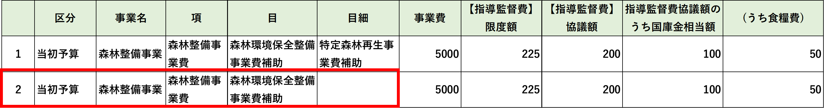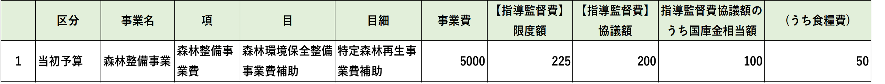 指導監督費協議額を0以上の半角数字で入力してください。 ※項が「地方創生基盤整備事業推進費」以外で目細が以下のいずれかに該当する場合は、指導監督費協議額を事業費で除算した値が0.045以下になる金額を半角数字で入力してください。 ・森林環境保全直接支援事業費補助 ・特定森林再生事業費補助 ・林道施設PCB廃棄物処理促進対策事業費補助 ・指導監督交付金 |