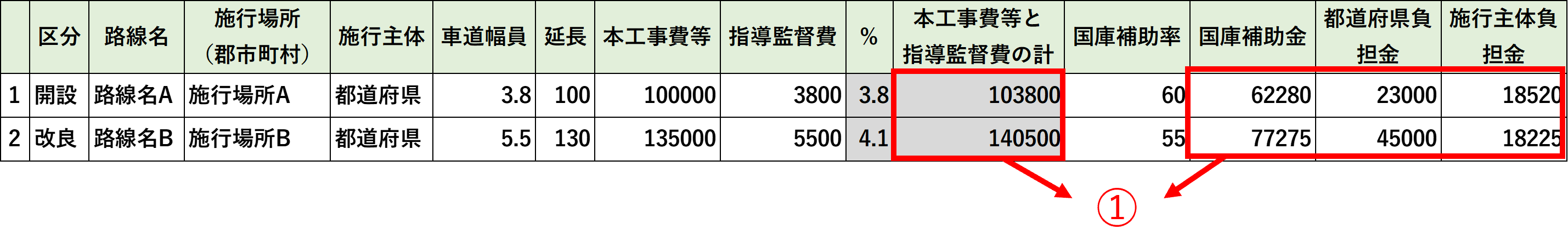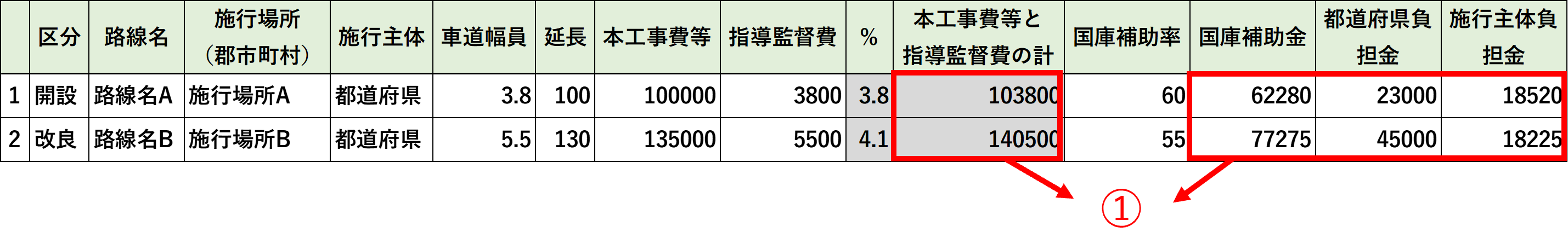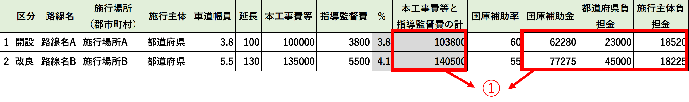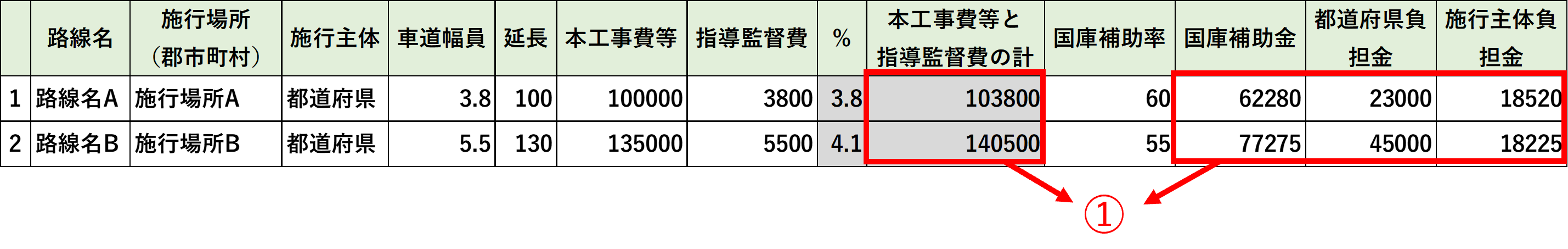 「国庫補助金」と「県(都道府)負担金」と「所有者(施行者)・施行主体負担金」の合計が表示されます。 |