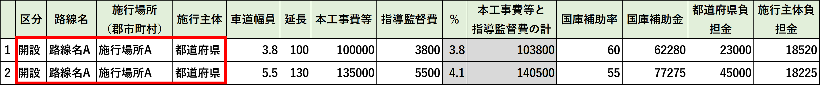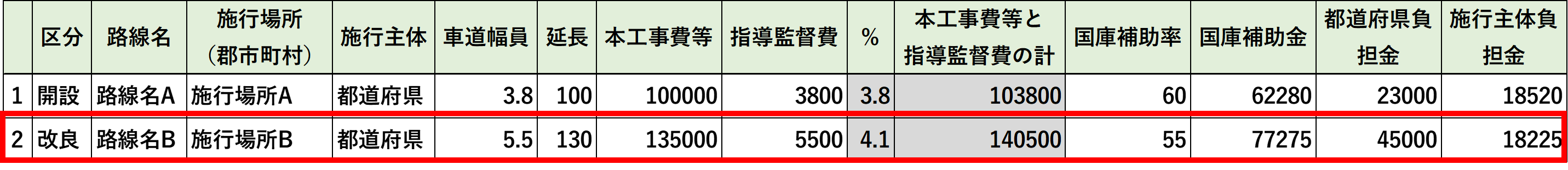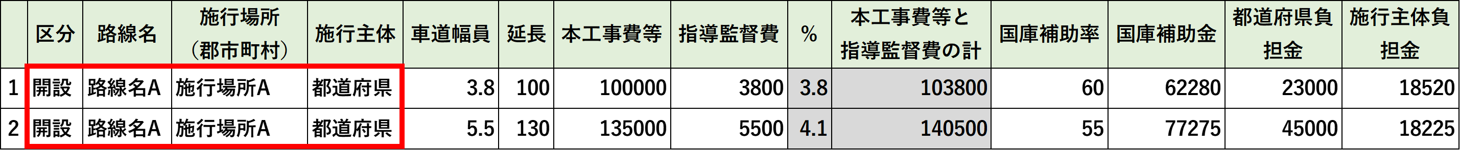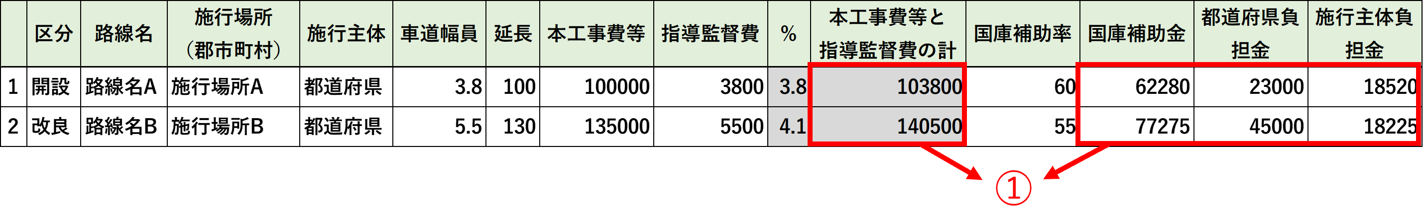 「国庫補助金」と「県(都道府)負担金」と「所有者(施行者)・施行主体負担金」の合計が表示されます。 |
