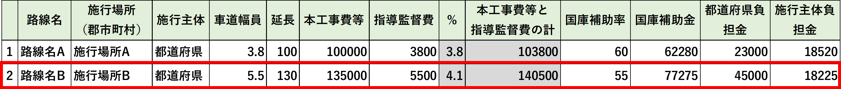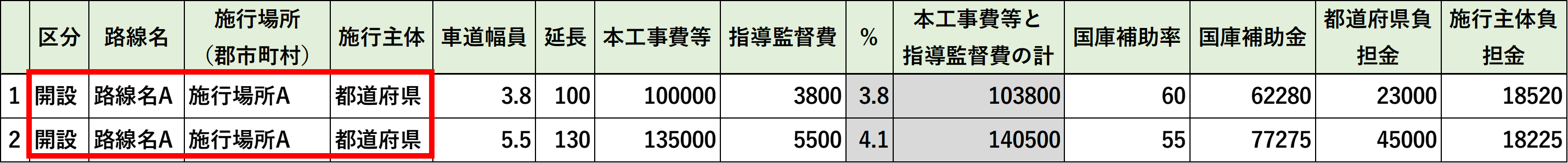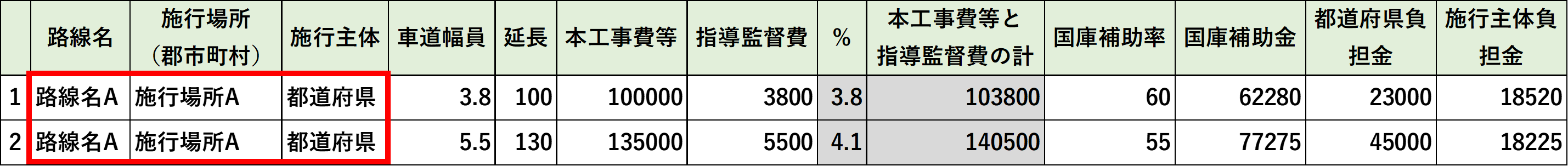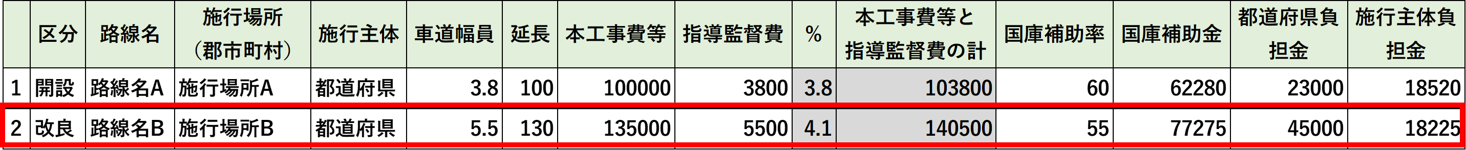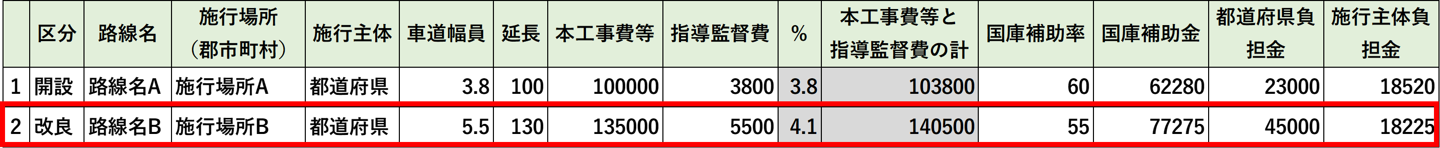 「国庫補助金」と「県(都道府)負担金」と「所有者(施行者)・施行主体負担金」の合計が表示されます。 |
