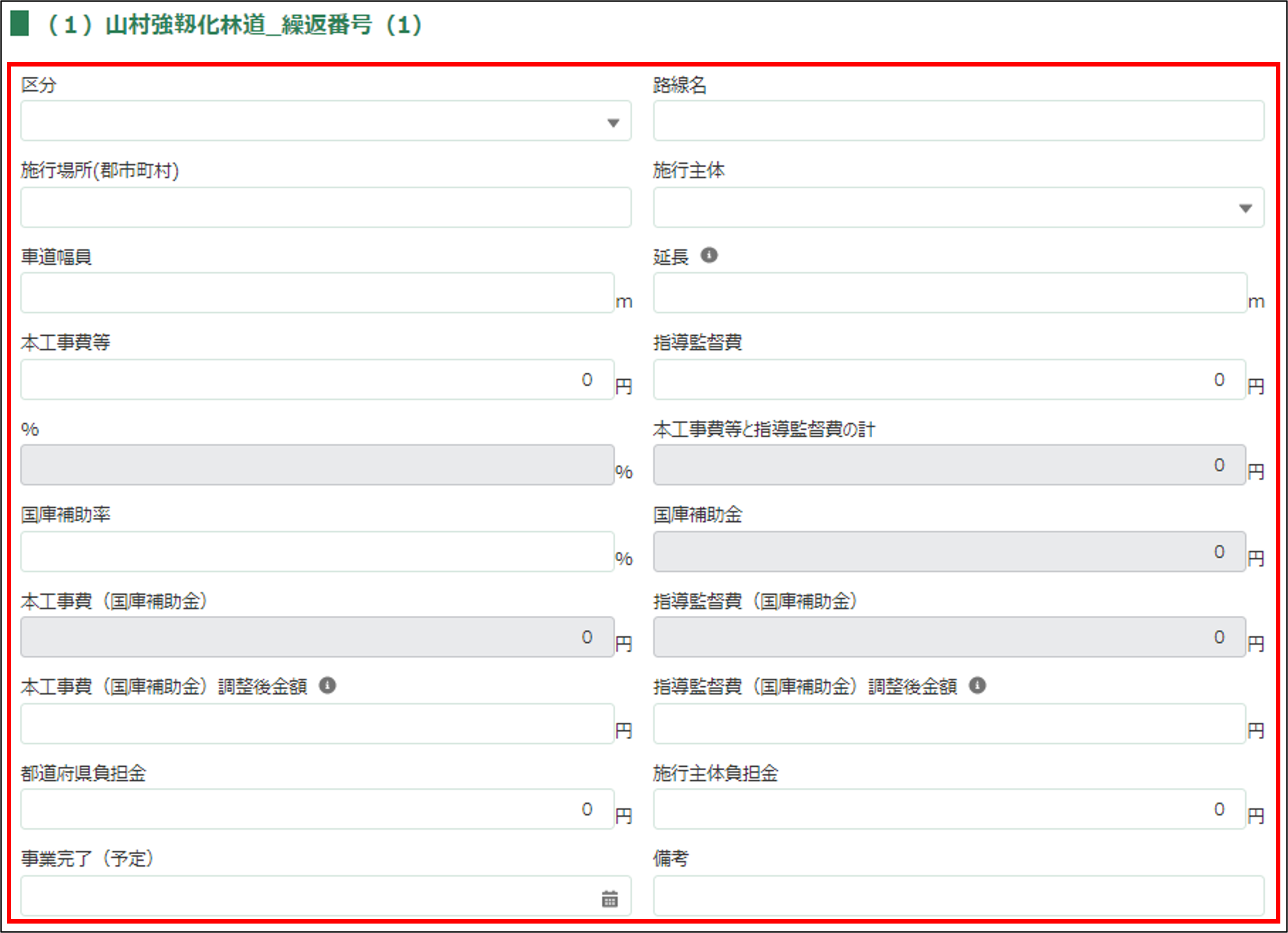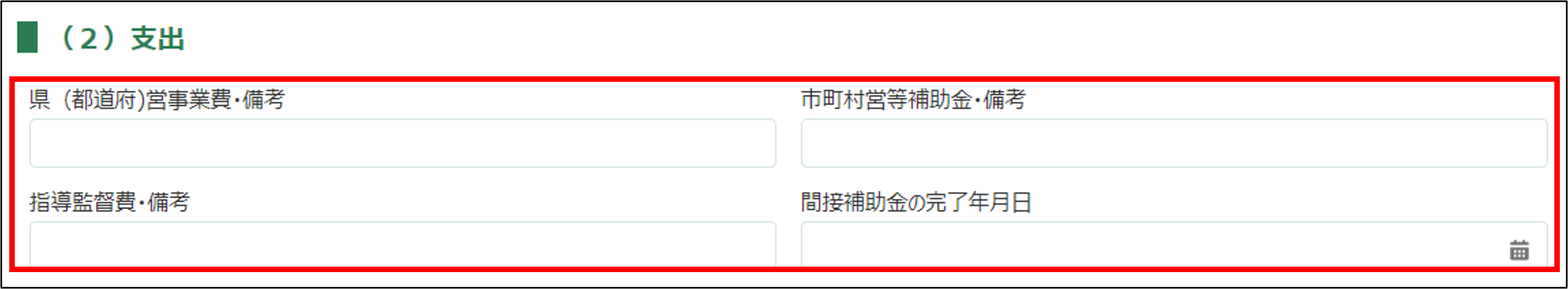「本工事費(国庫補助金)」と「指導監督費(国庫補助金)」の合計が表示されます。 「本工事費(国庫補助金)調整後金額」と「指導監督費(国庫補助金)調整後金額」が入力済みの場合はその合計が表示されます。 |