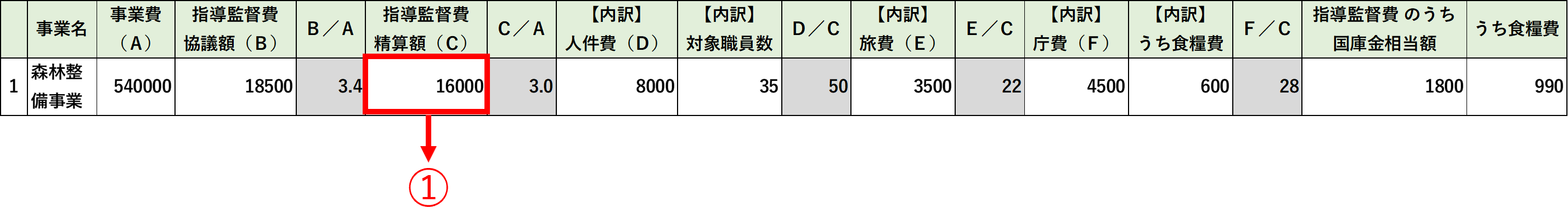 | ➀ | [人件費D][旅費E][庁費F]の合計は[指導監督費精算額C]になります。 |