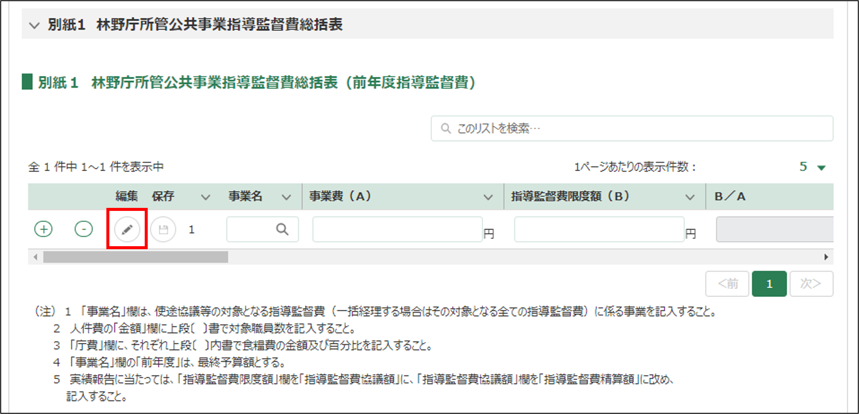・区分が「指導監督費」の事業費を区分が「うち県補助事業」の事業費で除算した値が0.045以下になるようにしてください。 [うち県補助事業の事業費]÷[指導監督費の事業費]<= 0.045 ・「前回の申請内容を反映する」ボタンで反映した明細行を削除したり区分を変更したりしないでください(区分以外は編集可能です)。 |