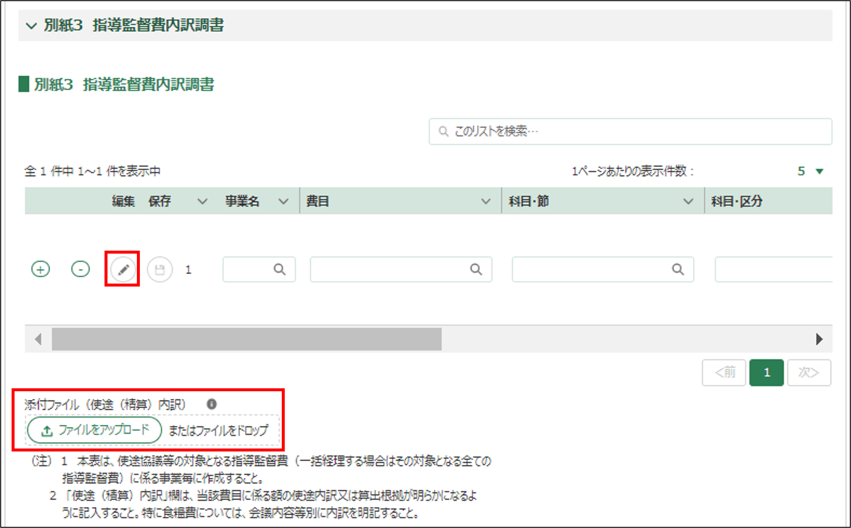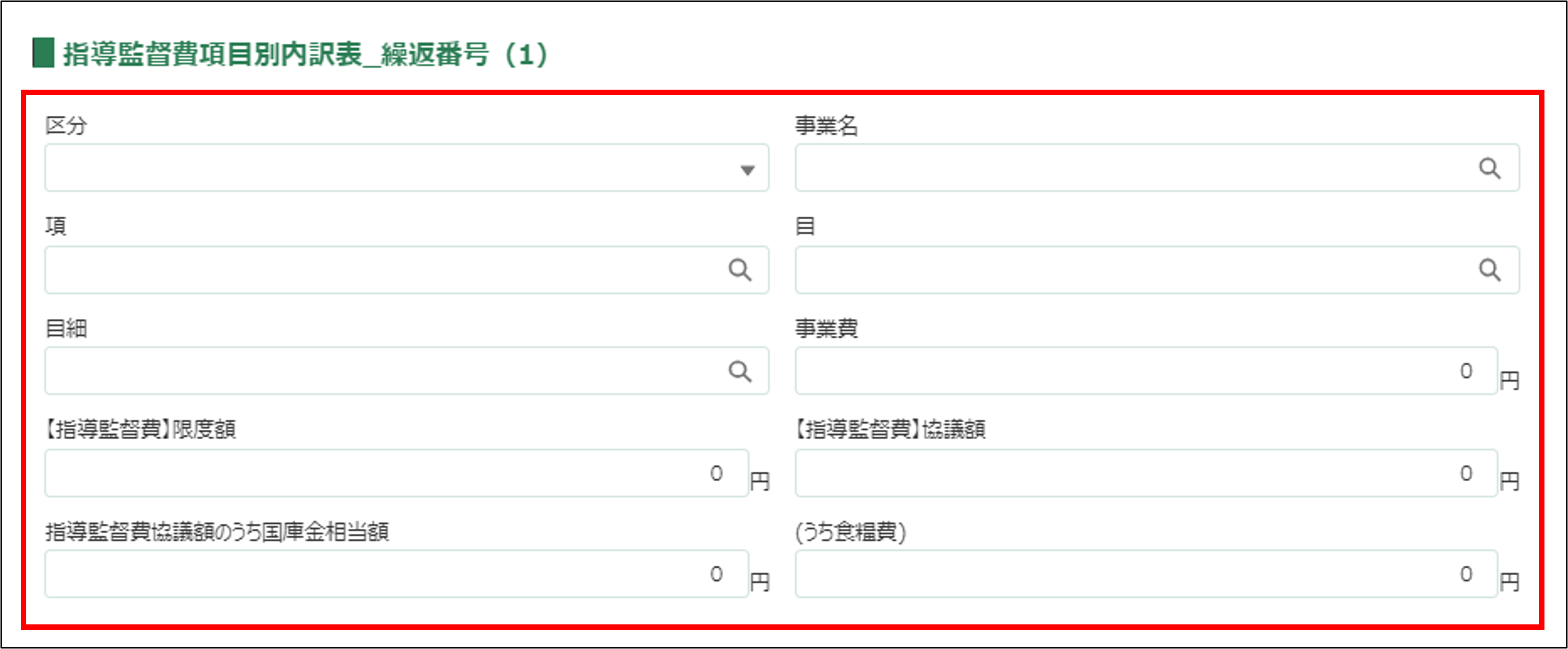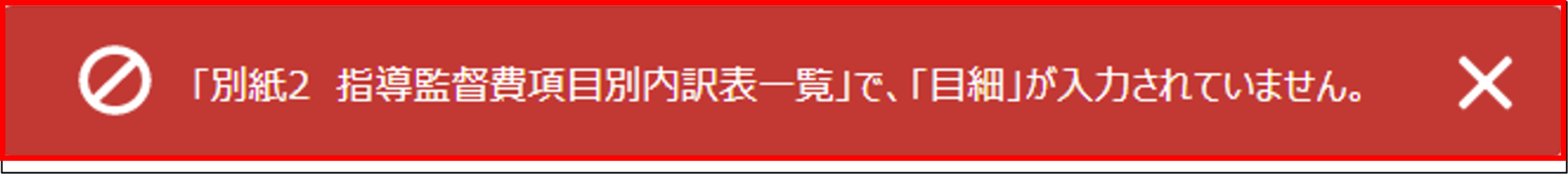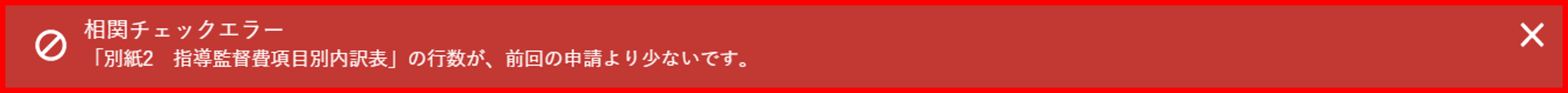 ・「区分」「事業名」「項」「目」「目細」のすべてが同じ行の登録はできません 。 ・「目」行の金額項目には「区分」「事業名」「項」「目」が同一の「目細」行の合計を入力してください。 ・「項」行の金額項目には「区分」「事業名」「項」が同一の「目」行の合計を入力してください。 ・「別紙2 指導監督費項目別内訳表」の「項」行の【指導監督費】精算額合計と、「別紙3 指導監督費内訳調書」の金額合計が一致する必要があります。 ・「前回の申請内容を反映する」ボタンで反映した明細行を削除したり、区分、事業名、項、目、目細を変更したりしないでください(区分、事業名、項、目、目細以外は編集可能です)。 |