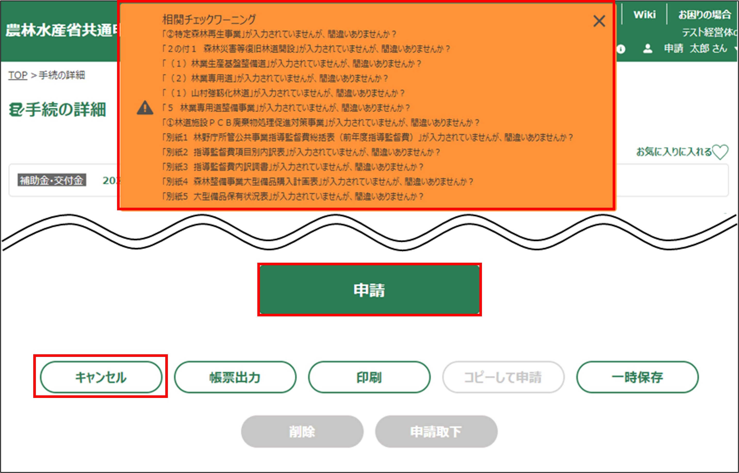 25.「申請」ボタンをクリックすると、申請内容のエラーチェックが行われます。