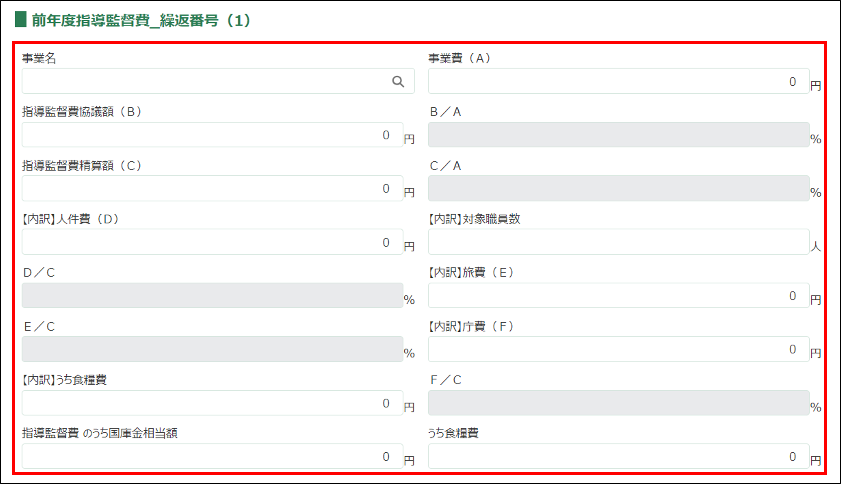 ・「指導監督費精算額(C)」と「【内訳】人件費(D)」「【内訳】旅費(E)」「【内訳】庁費(F)」の合計が一致する必要があります。 [人件費D]+[旅費E]+[庁費F]=[指導監督費精算額C] ・「前回の申請内容を反映する」ボタンで反映した明細行は削除しないでください。 |
