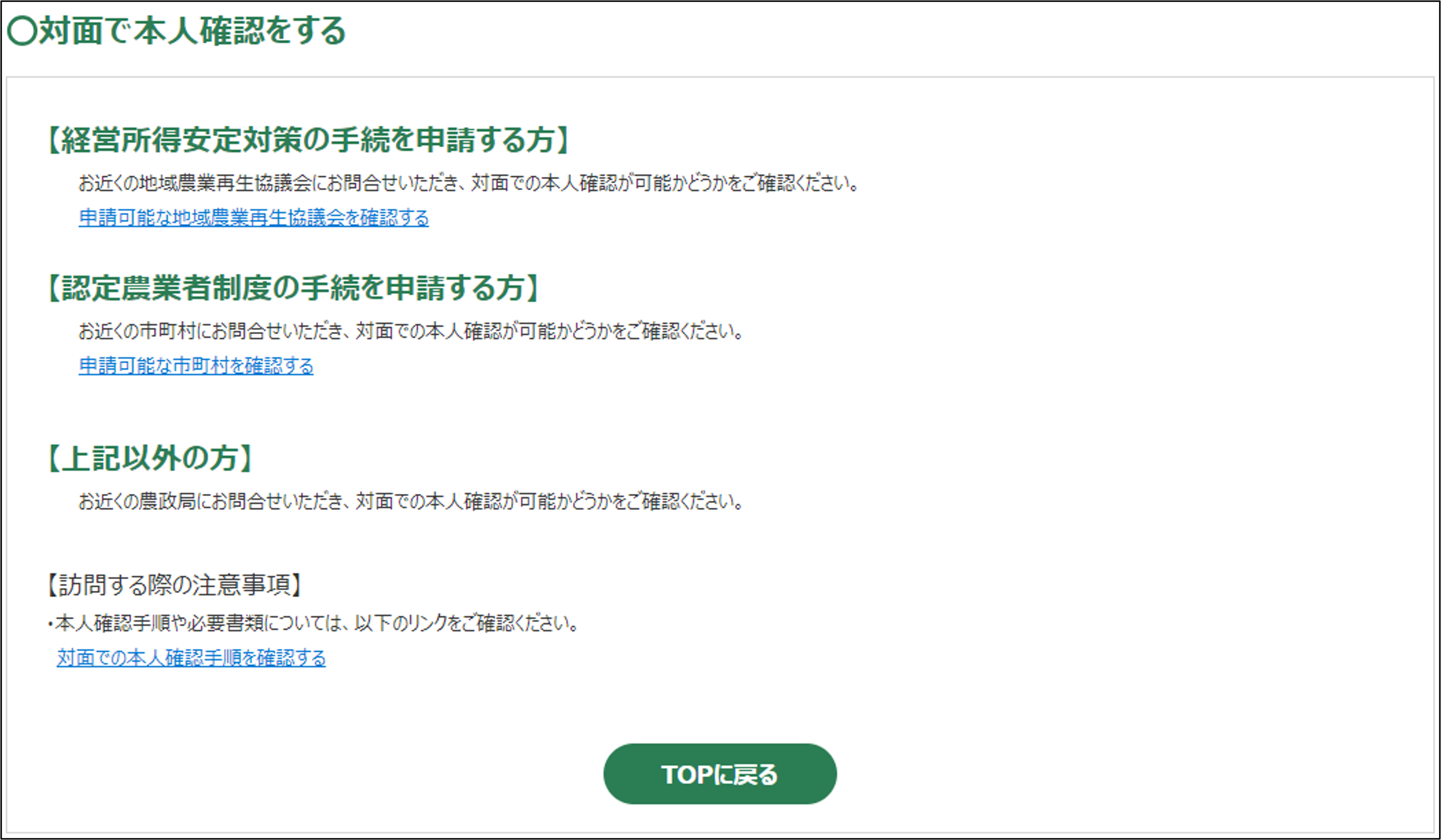 申請したい手続に応じたリンクをクリックし、対面での本人確認が可能かどうかを各組織に確認してください。