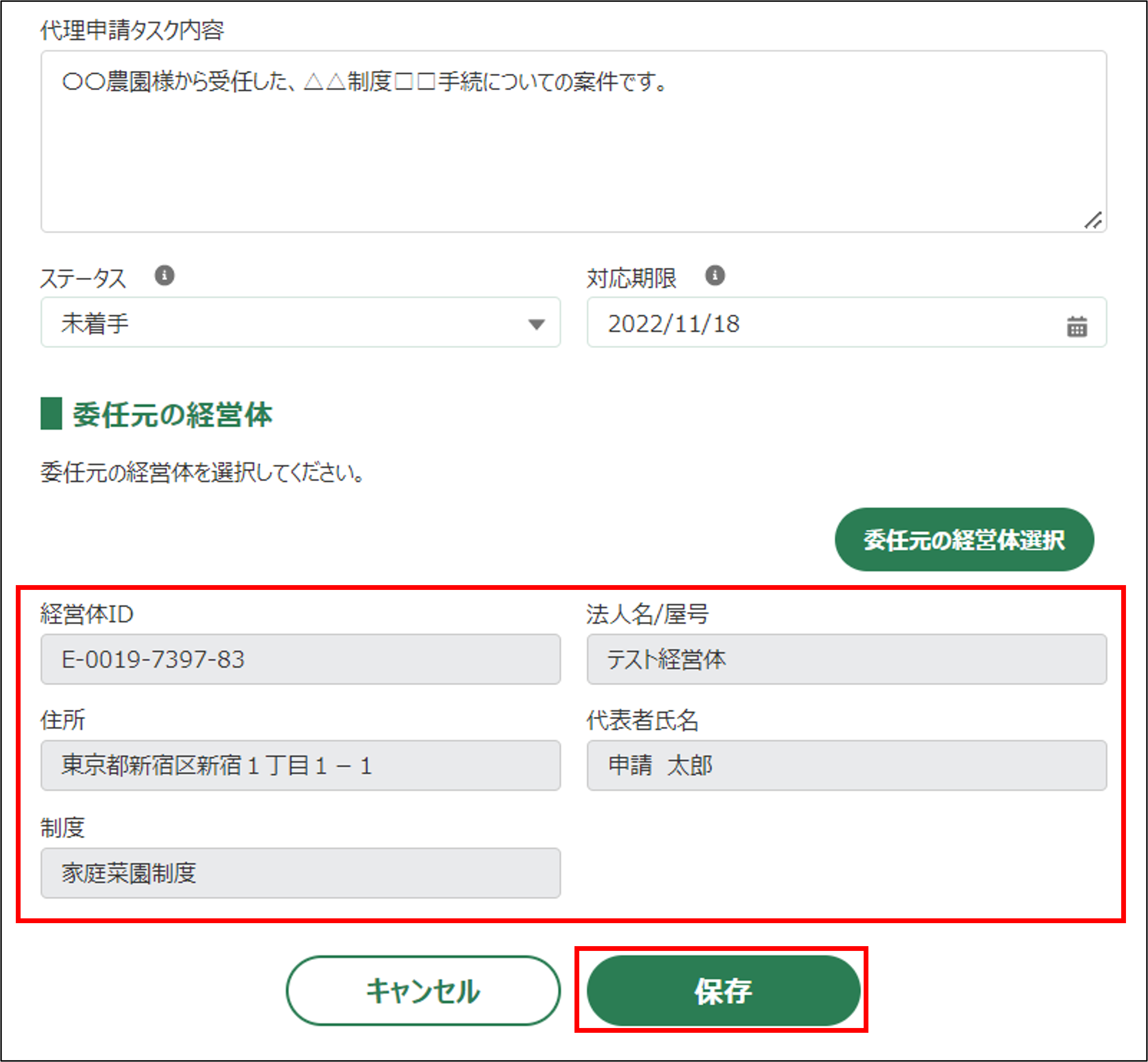 6.「委任元の経営体」欄に、選択した情報が表示されます。確認し、「保存」ボタンをクリックします。