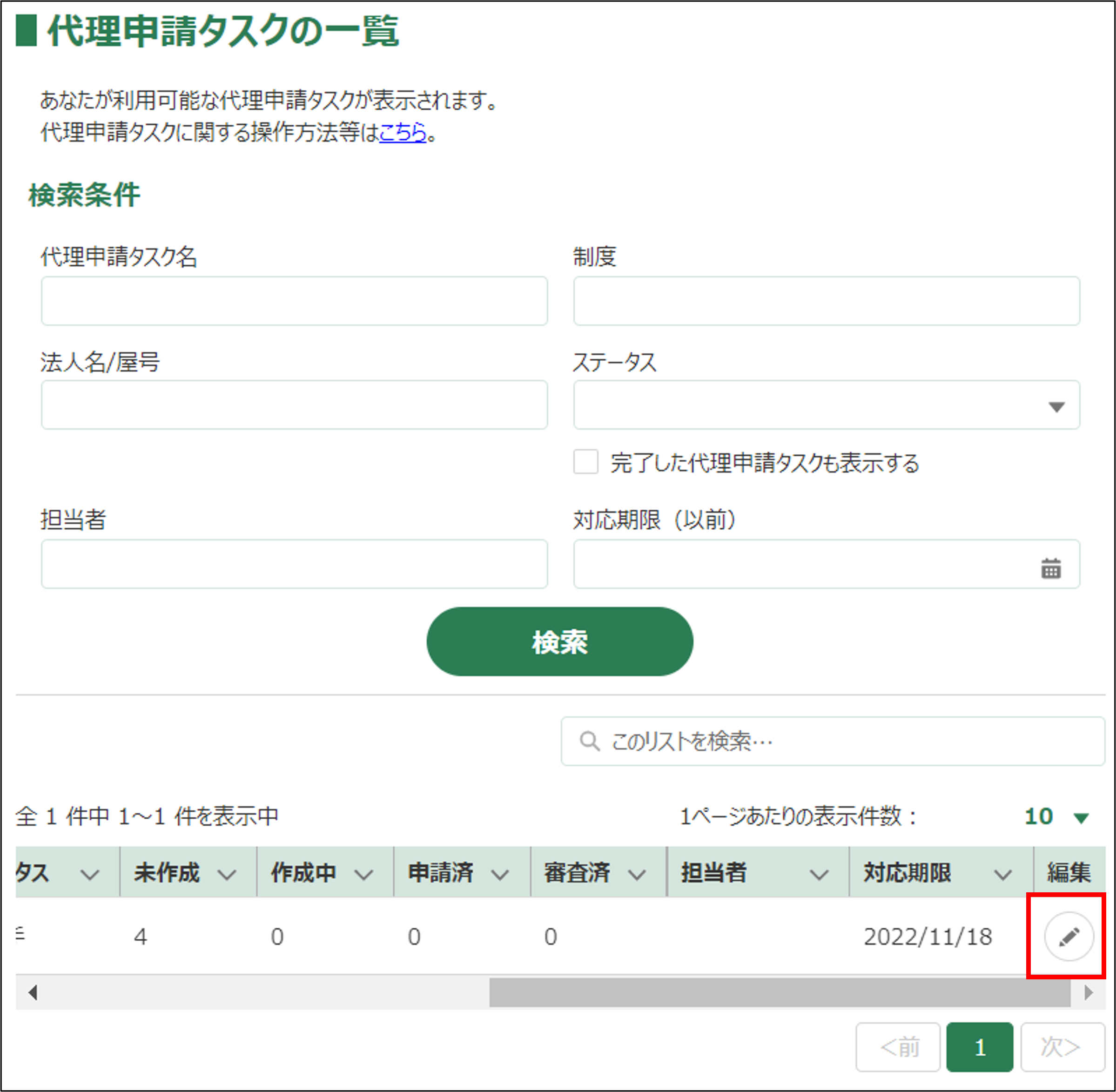 代理申請タスクの一覧にて、対象タスクの「」ボタンをクリックします。