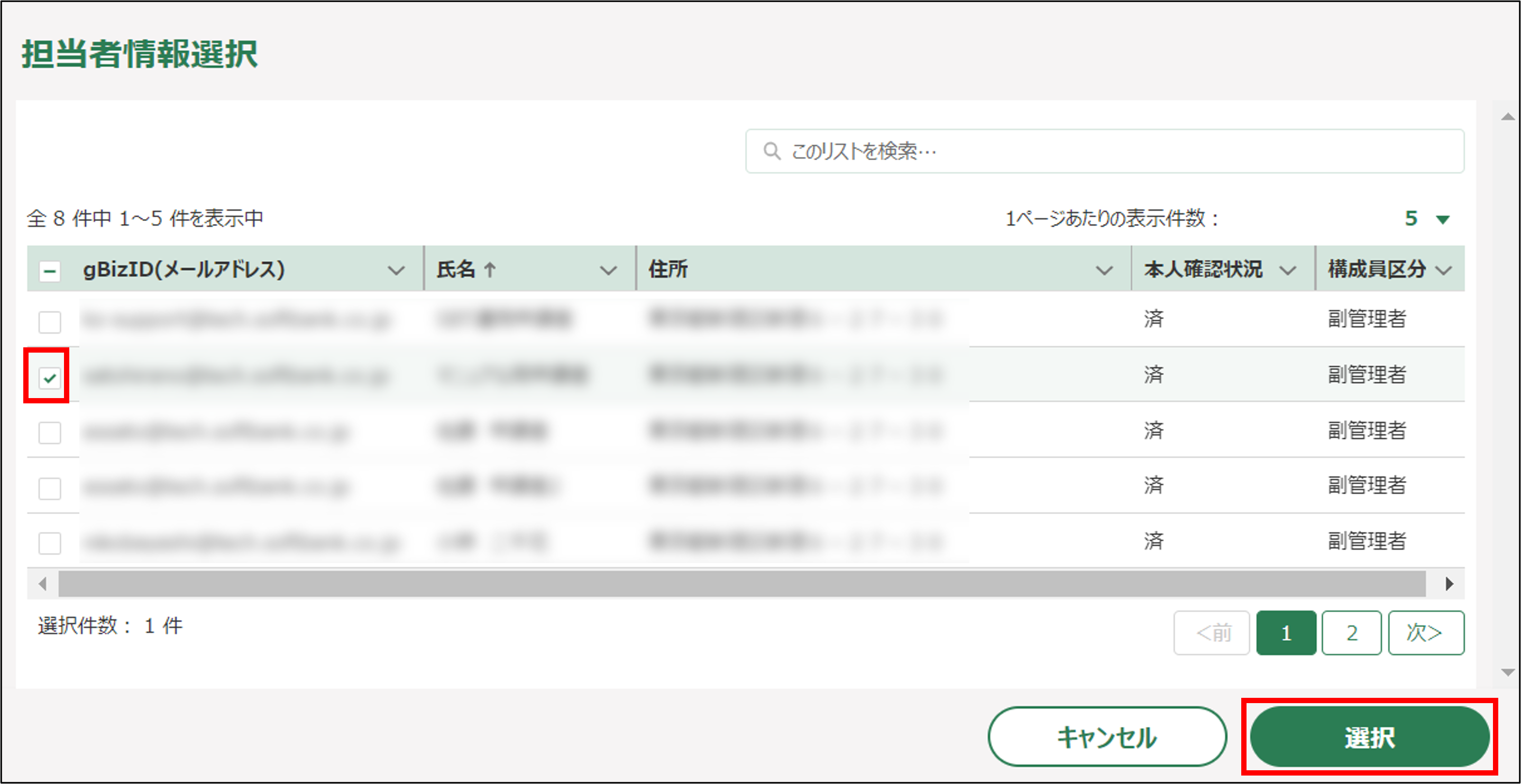 9.自経営体の構成員一覧が表示されます。タスクを担当する経営体の構成員を選び、「選択」ボタンをクリックします。