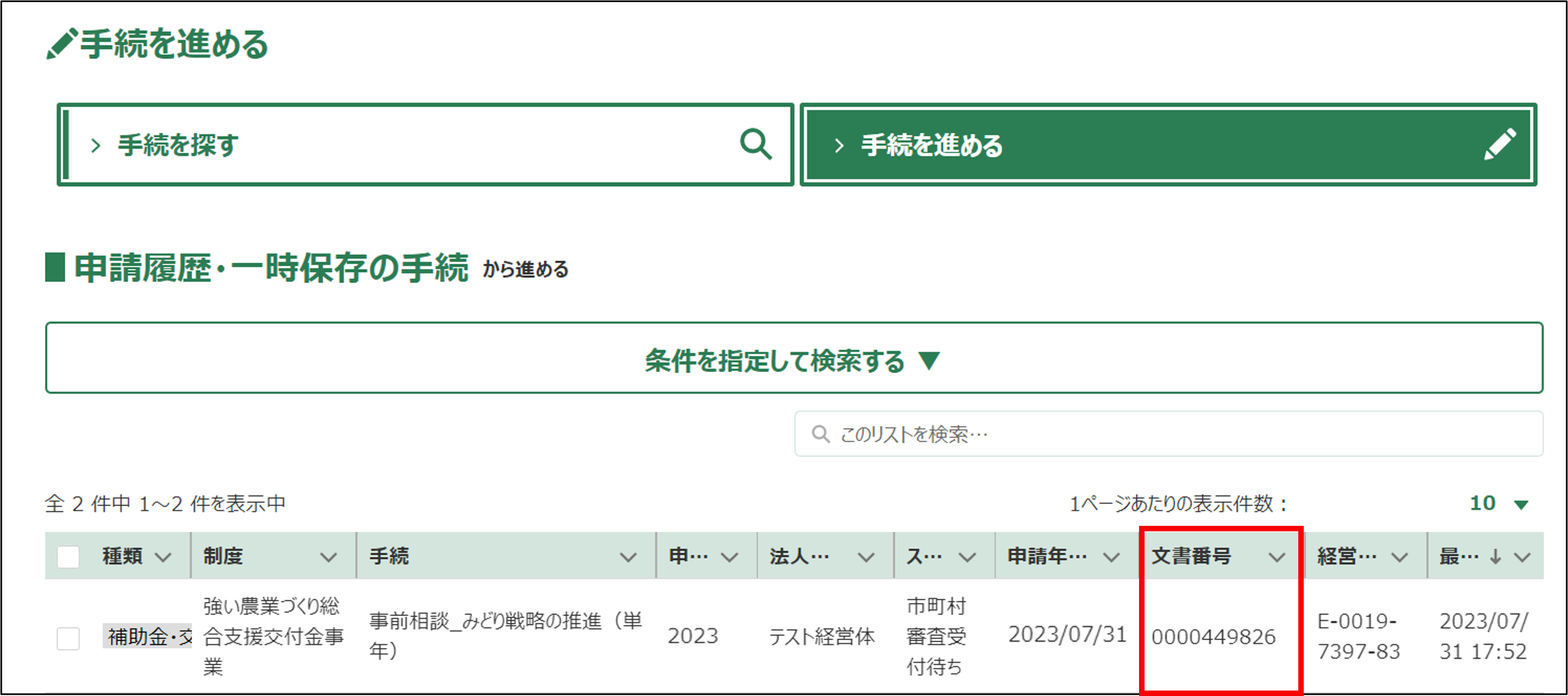 2. 「申請履歴・一時保存の手続から進める」画面より、コピーしたい申請の「文書番号」を控えます。