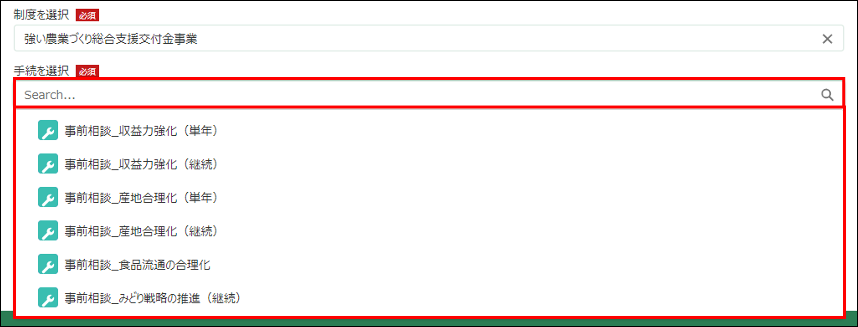 3.「制度を選択」の入力欄をクリックし、表示された一覧から「強い農業づくり総合支援交付金事業」をクリックします。