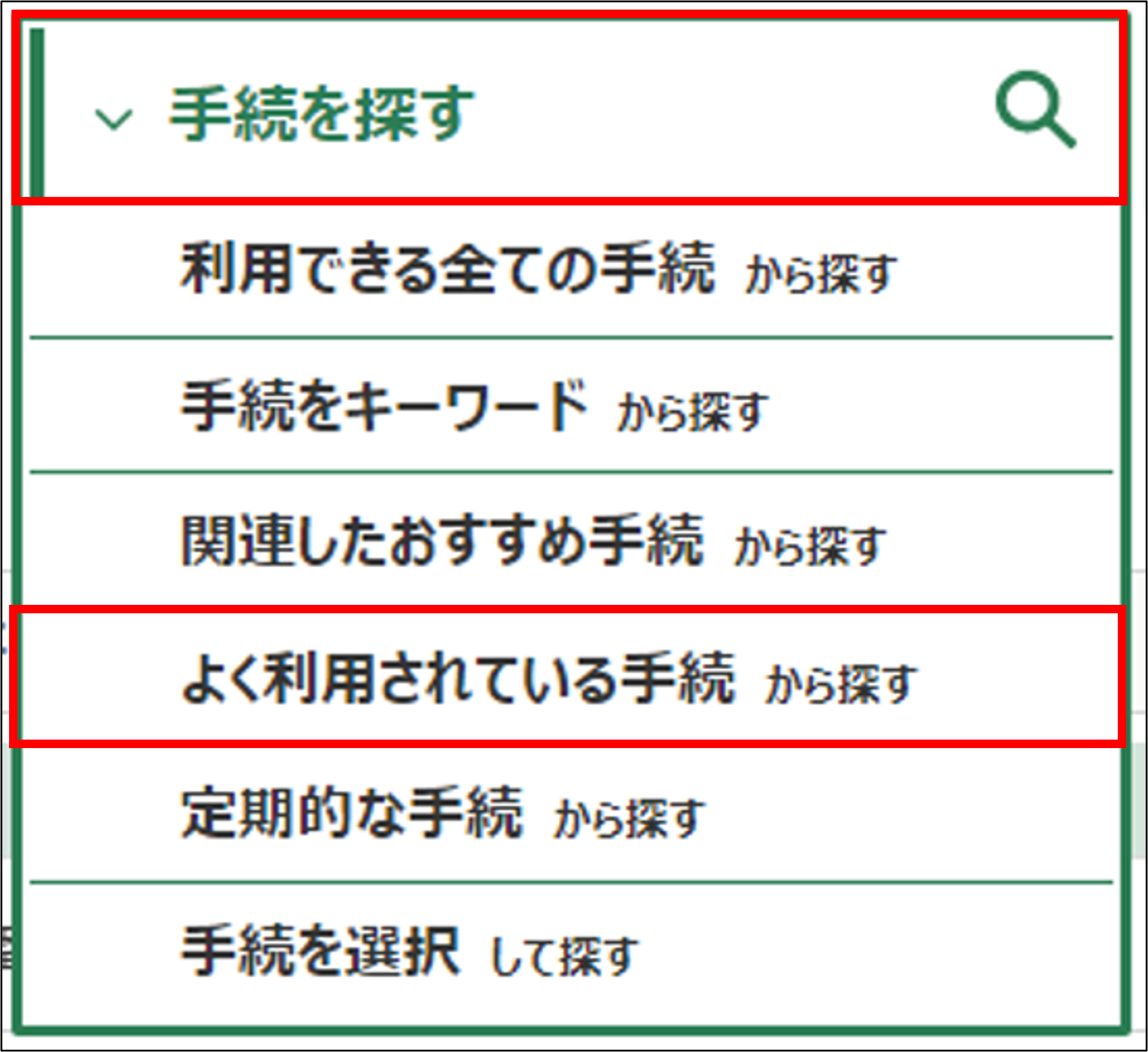 1.ホーム画面上部の「手続を探す」をクリックし、表示された一覧から「よく利用されている手続から探す」をクリックします。