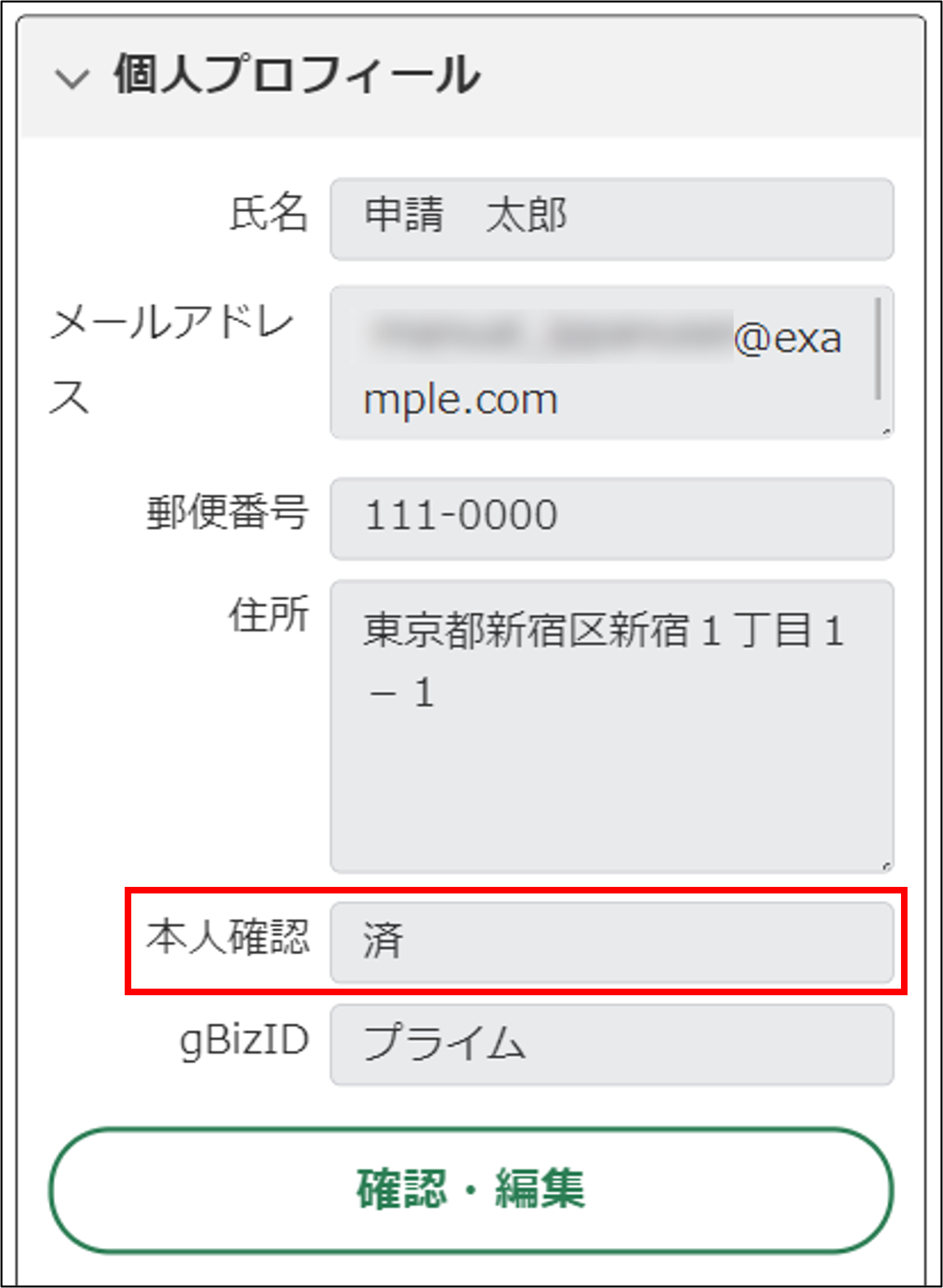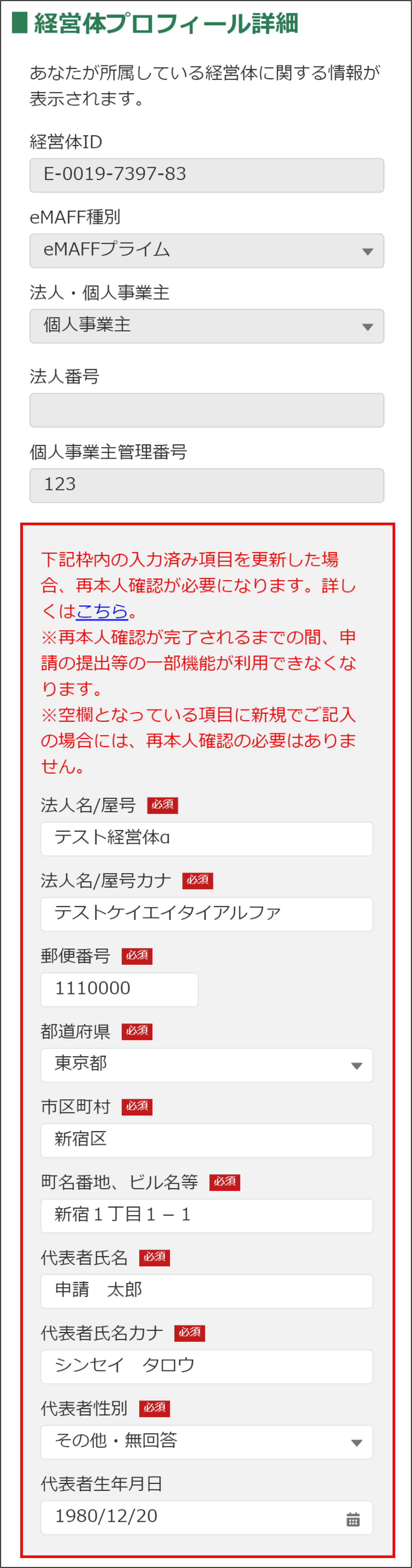経営体プロフィール詳細画面で、背景が灰色の入力済み項目を更新すると、事前に行った本人確認時の情報と異なってしまうため、再度本人確認を行う必要があります。