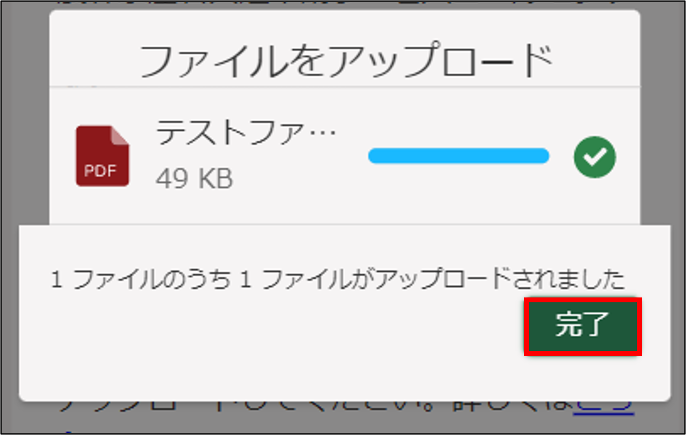 6.「ファイルをアップロード」画面が表示されます。「XファイルのうちXファイルがアップロードされました」を確認し、「完了」ボタンをタップします。