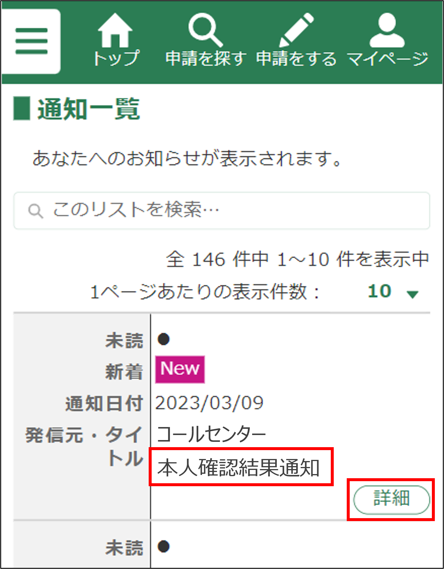 4.「本人確認結果通知」の「詳細」ボタンをタップします。