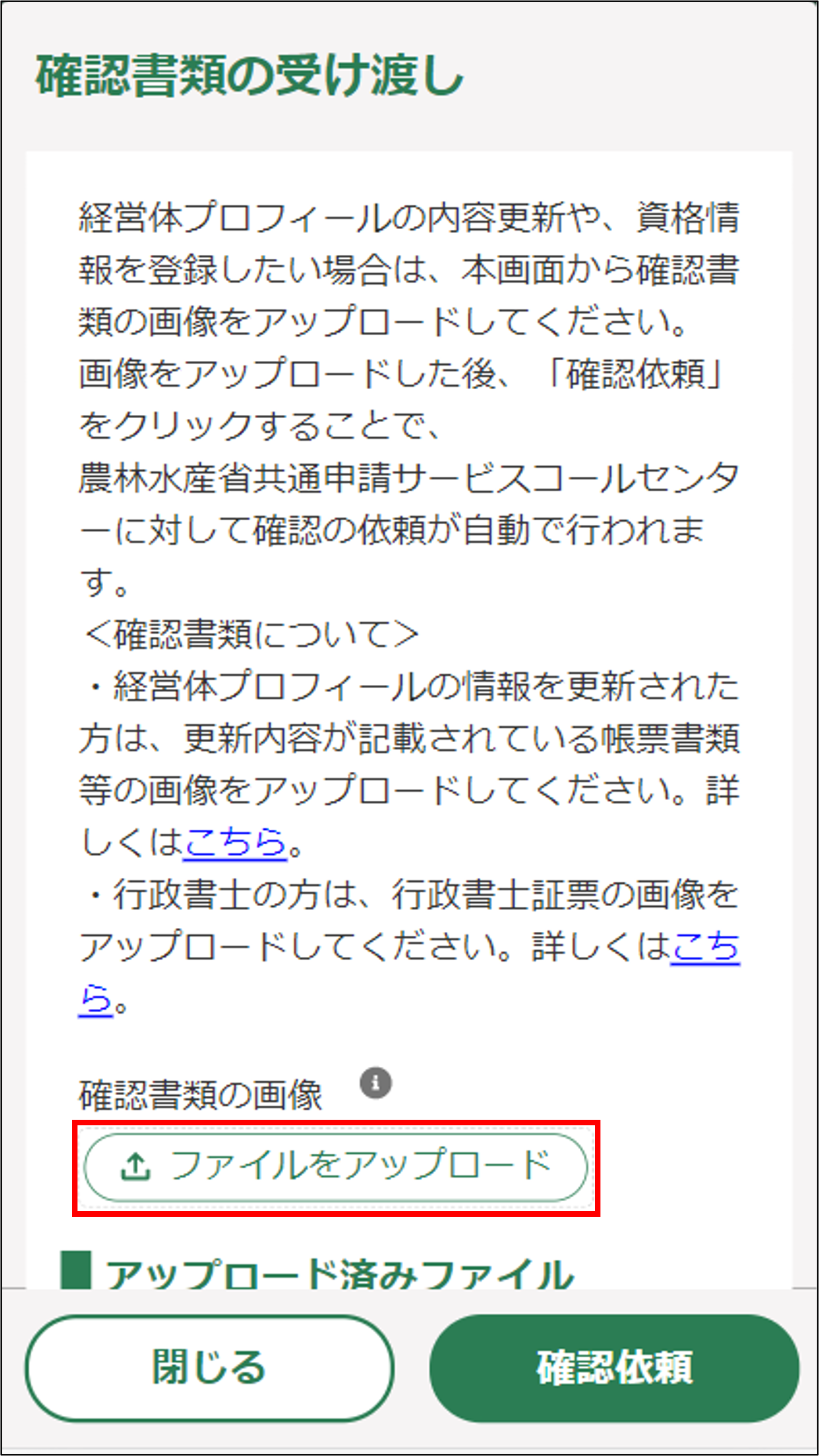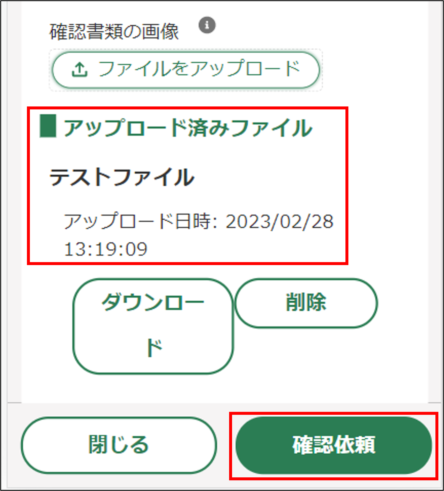 「アップロード済みファイル」欄にアップロードしたファイル名が表示されていることを確認し、「確認依頼」ボタンをタップします。