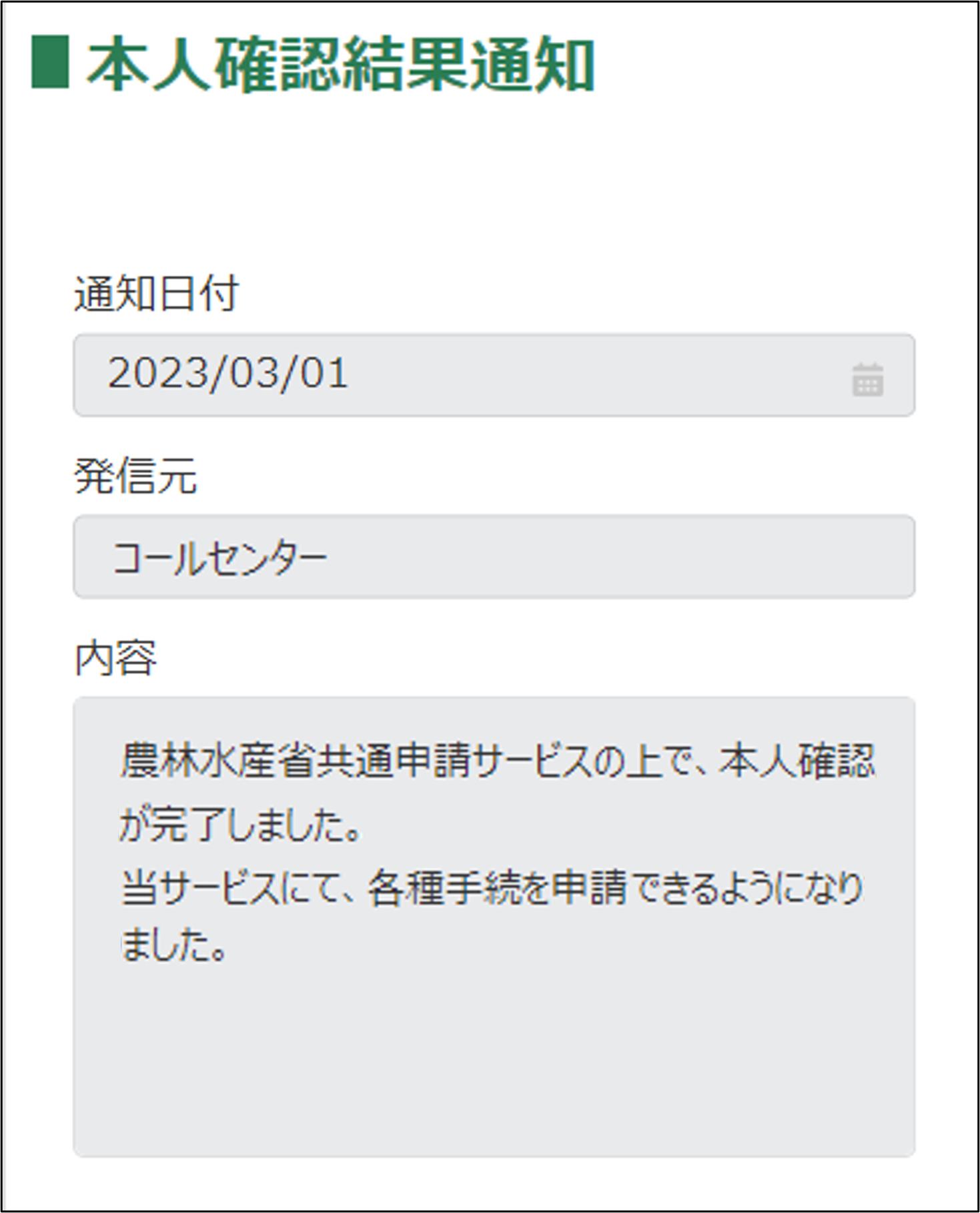 この時点では依頼が完了した状態であり、再本人確認は完了していません。コールセンターにて再本人確認が完了すると、「本人確認結果通知」が届きます。