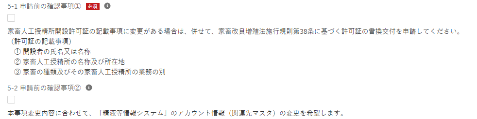 「5-2 申請前の確認事項②」については、「3 変更に係る事項」のうち、「家畜人工授精所の構造、設備及び器具」以外の箇所に変更があり、かつ、精液等情報システム(国が整備した全国統一システム)における関連先マスタを取得している場合、当該関連先マスタの変更手続が必要となります。