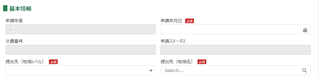 「申請年月日」、「提出先(地域レベル)」、「提出先(地域名)」を入力します。