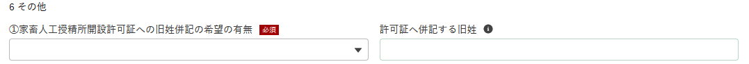 「6 その他」の「①家畜人工授精所開設許可証への旧姓併記の希望の有無」について、「有」又は「無」を選択してください。