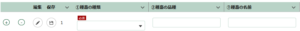 「①種畜の種類」については、リスト中の「牛,馬,めん羊,山羊,豚,対象なし」から選択してください。対象となる種畜がいない場合であっても、必ず「対象なし」を選択してください。複数選択する場合は、「3 家畜の種類及びその業務の別」で入力した「①家畜の種類」の入力順と統一してください。