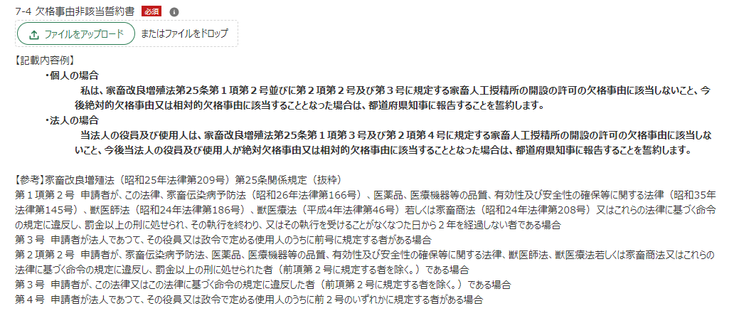 家畜改良増殖法第25条第2項第2号に規定する欠格事由に該当する場合(法人の場合、役員等に該当する者がいる場合)に「7-5 確定判決謄本」を提出してください。