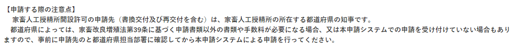 なお、当該手続の業種は「農業」、法令名は「家畜改良増殖法」、制度名は「家畜人工授精所の開設」、手続名は「家畜人工授精所開設許可証の再交付の申請」です。